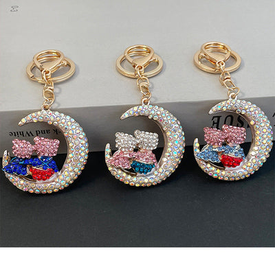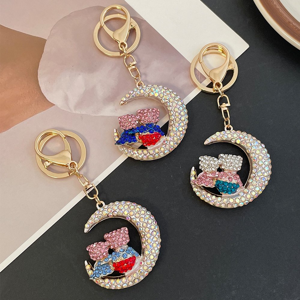 Celebrate love with our Romantic Moon Couple Bear Keychain. This adorable accessory features a pair of charming bears sitting on a crescent moon, adorned with sparkling diamonds. It's the perfect symbol of romance and togetherness, adding a touch of whimsy and elegance to your daily essentials.