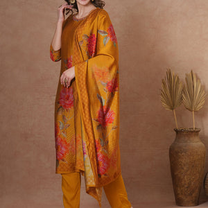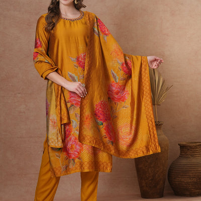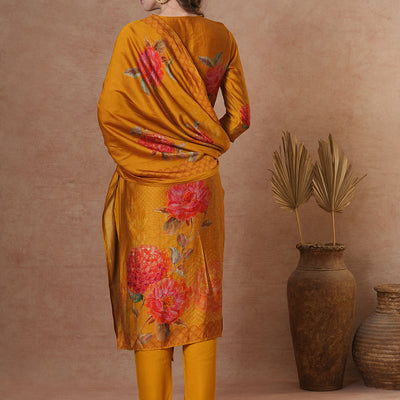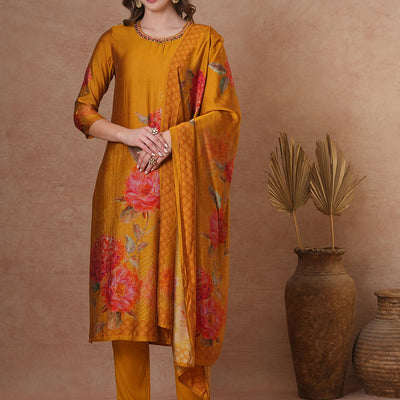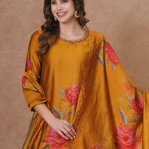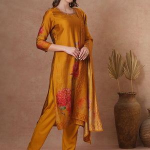 Abstract Floral Printed & Embroidered Straight Kurta with Pant and Dupatta - Mustard