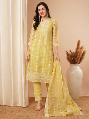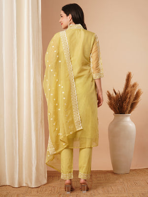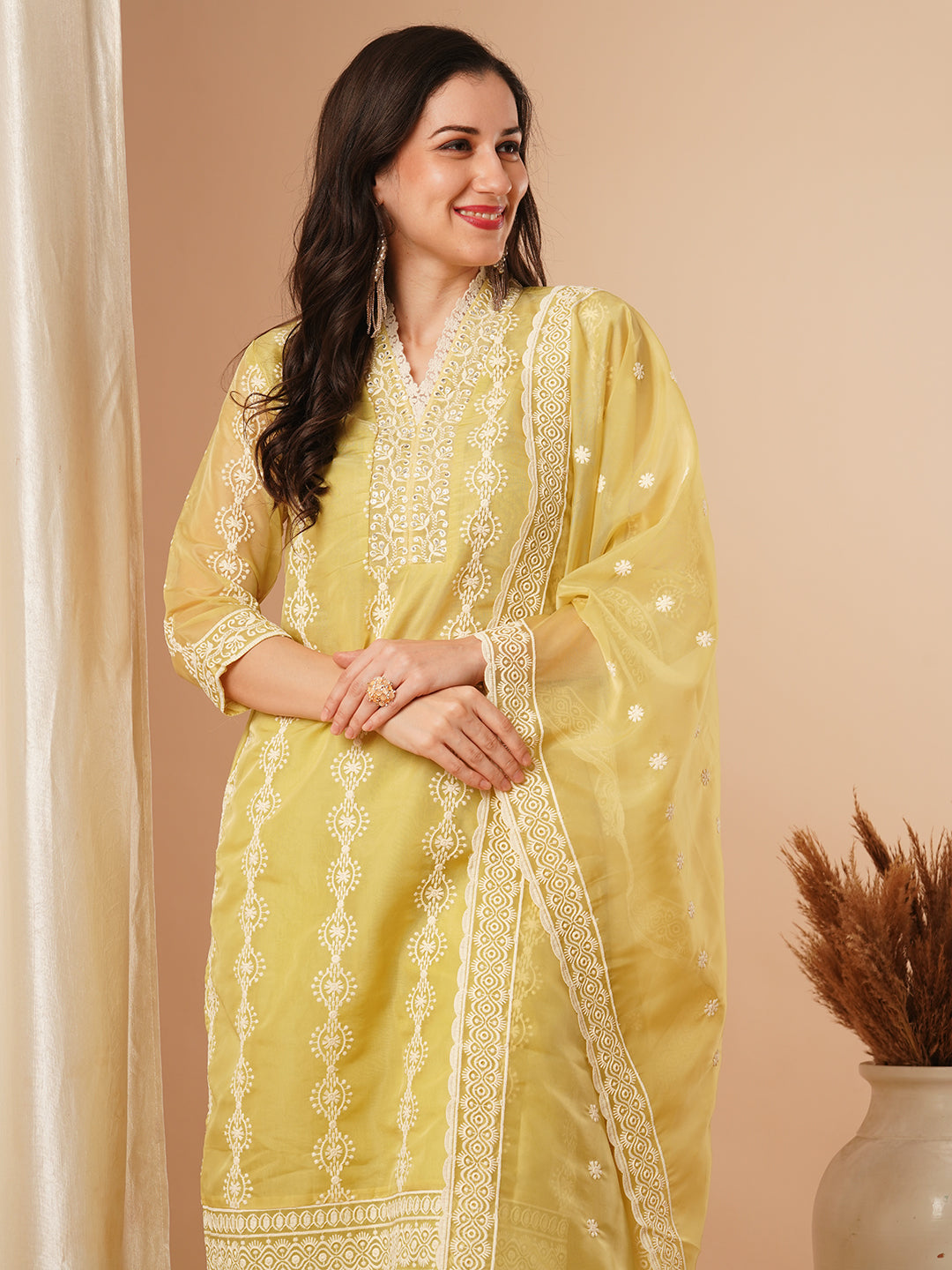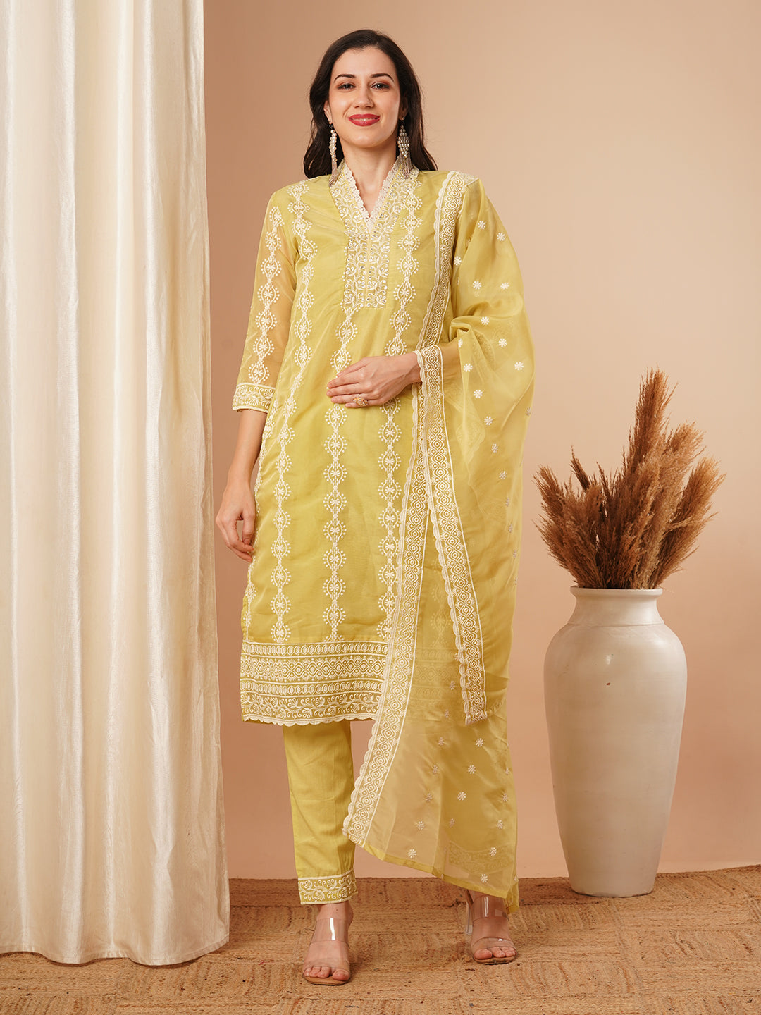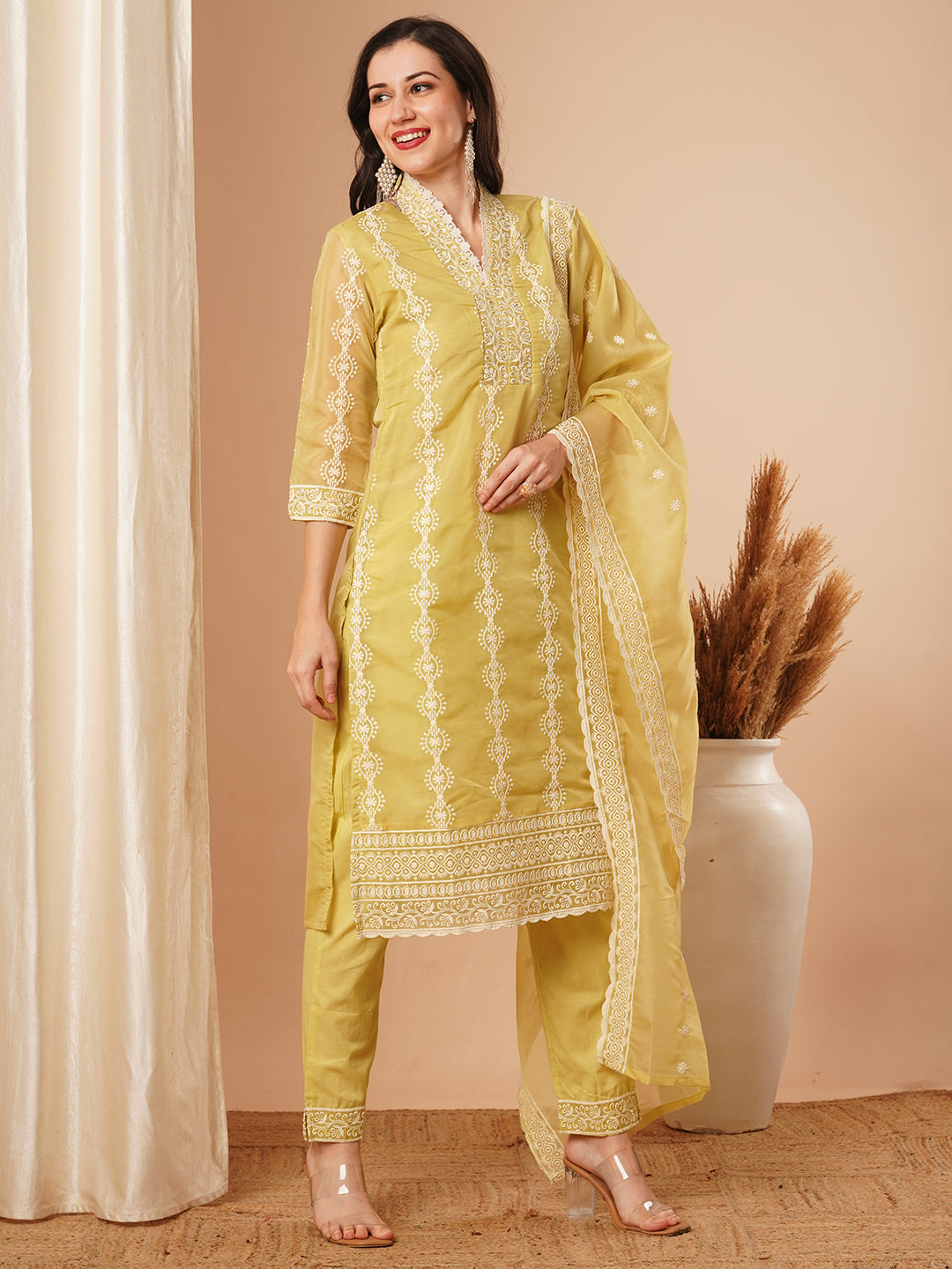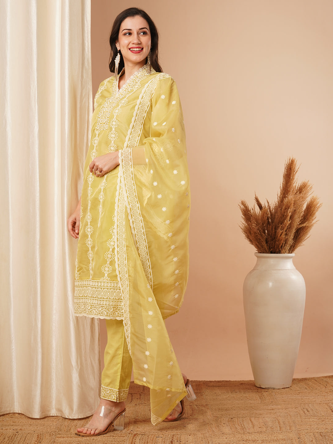 Ethnic Chikankari Embroidered Straight Fit Kurta with Pant and Dupatta - Green