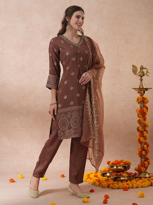 Ethnic Hand Embroidered Jacquard Straight Kurta with Pant & Dupatta - Brown