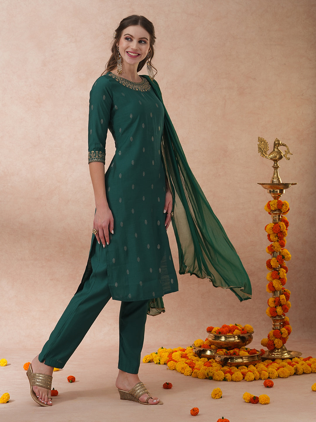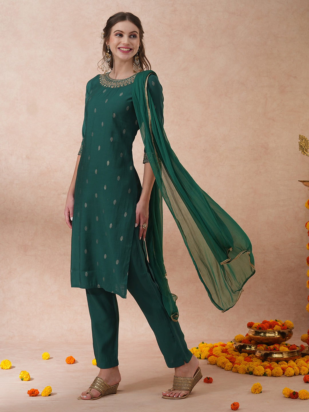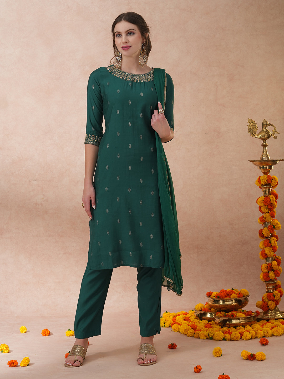 Solid Ethnic Embroidered Straight Fit Kurta with Pant & Dupatta - Green