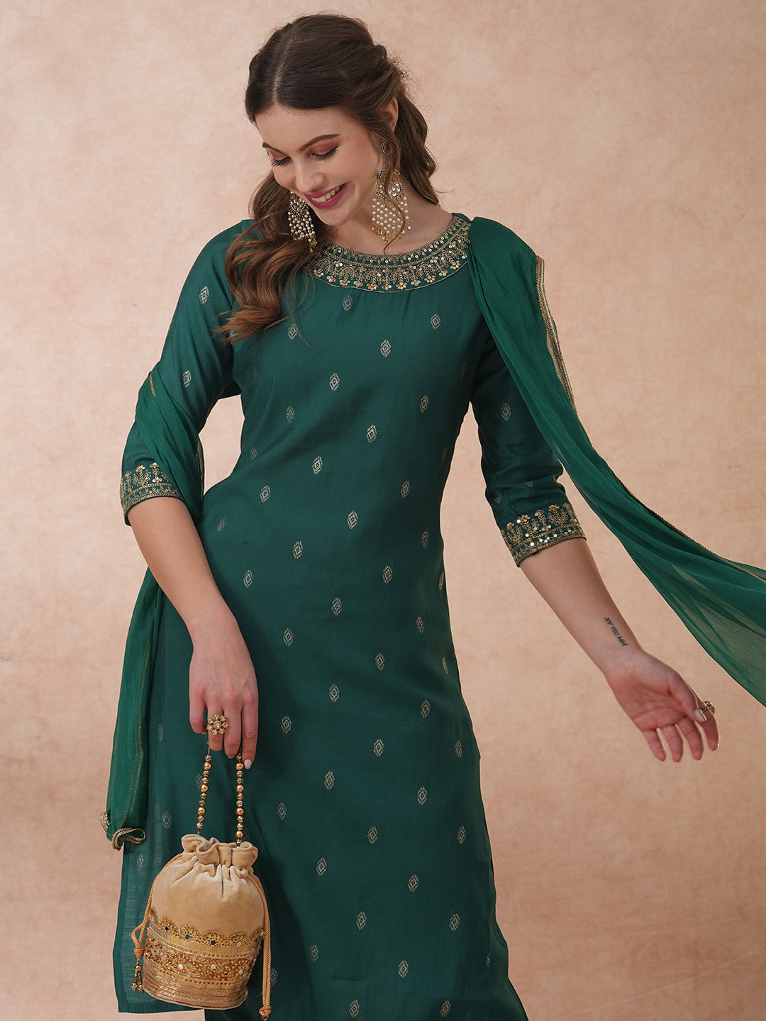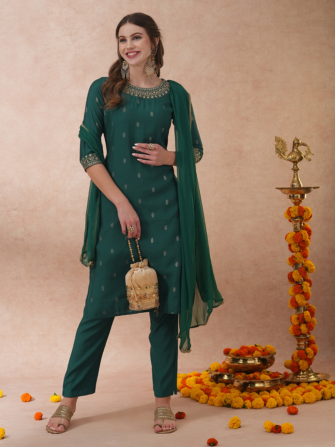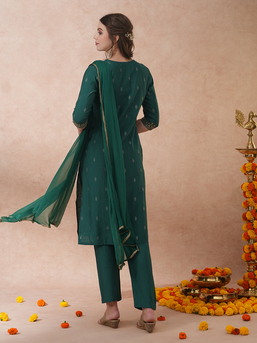 Solid Ethnic Embroidered Straight Fit Kurta with Pant & Dupatta - Green