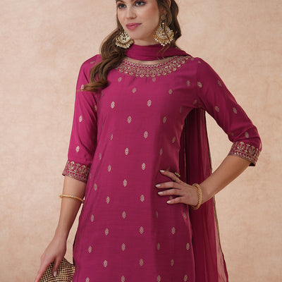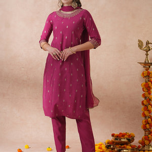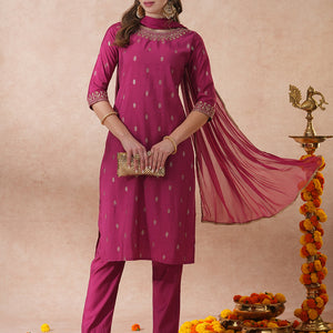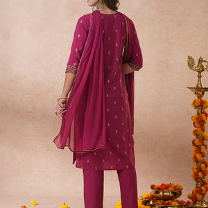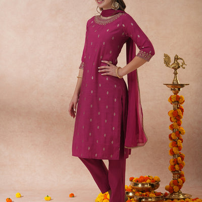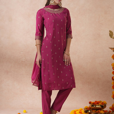 Solid Ethnic Embroidered Straight Fit Kurta with Pant & Dupatta - Mauve