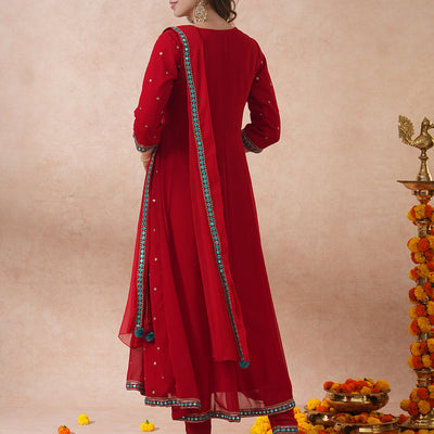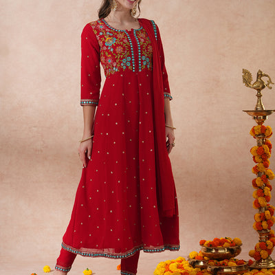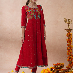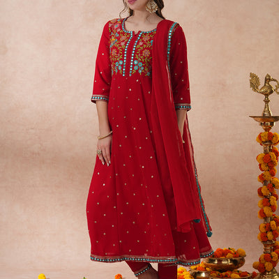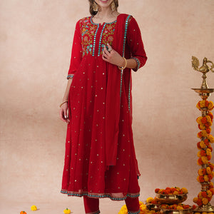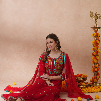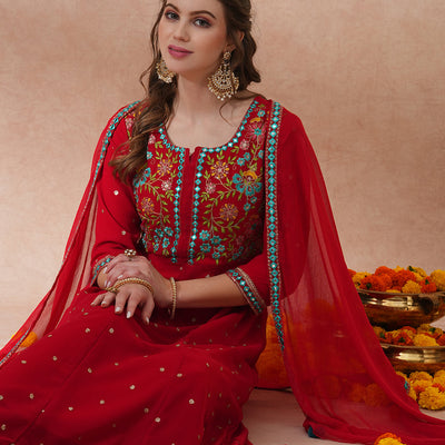 Solid Floral Embroidered Anarkali Flared Kurta with Pant & Dupatta - Red