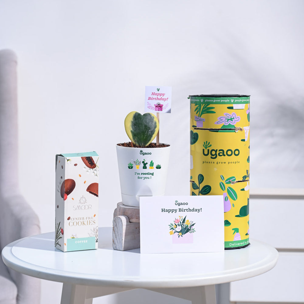 Make your loved one's birthday unforgettable with this charming hamper featuring the Heart Hoya Plant. This unique and eye-catching plant is known for its heart-shaped leaves and easy maintenance. Paired with a delicious box of Smoor Cookies (centre filled), this gift is sure to satisfy any sweet tooth. Customize your gift with a heartfelt message on the included message cards, and top it off with a cute plant pop to create a truly memorable birthday surprise.