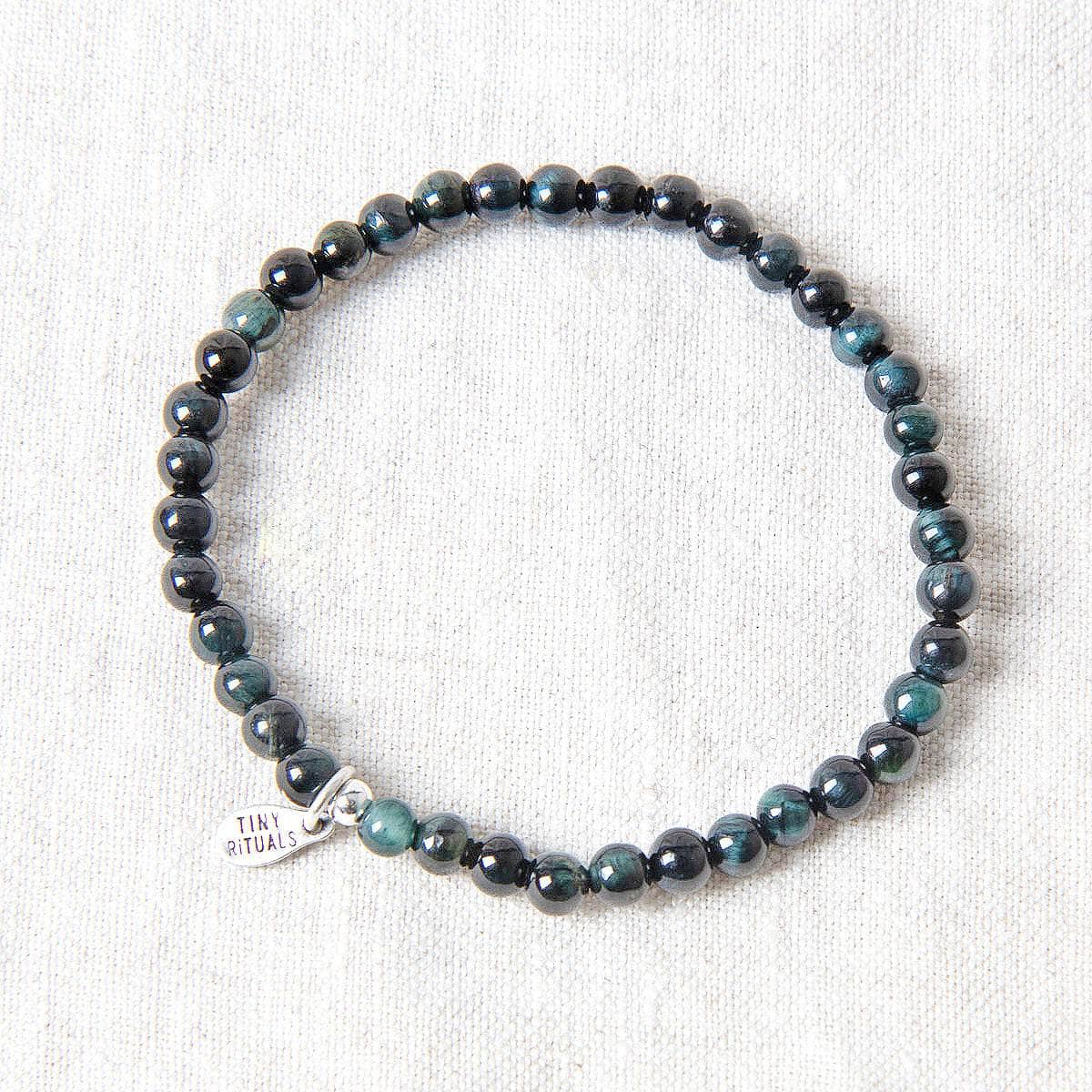 Also known as Hawk-Eye, Falcon Eye, and Ox-Eye - the Blue Tiger Eye Bracelet is served up with ocean shades, and protective energy, and is a dab hand at increasing calm. Like many blue stones, this shade of Tigers Eye is here to ease communication by working to cleanse blockages in the throat chakra. When our throat chakra is open and ready, we are able to communicate our needs, be more authentic in connection, and use our voice to rise up and meet the life we want to live.