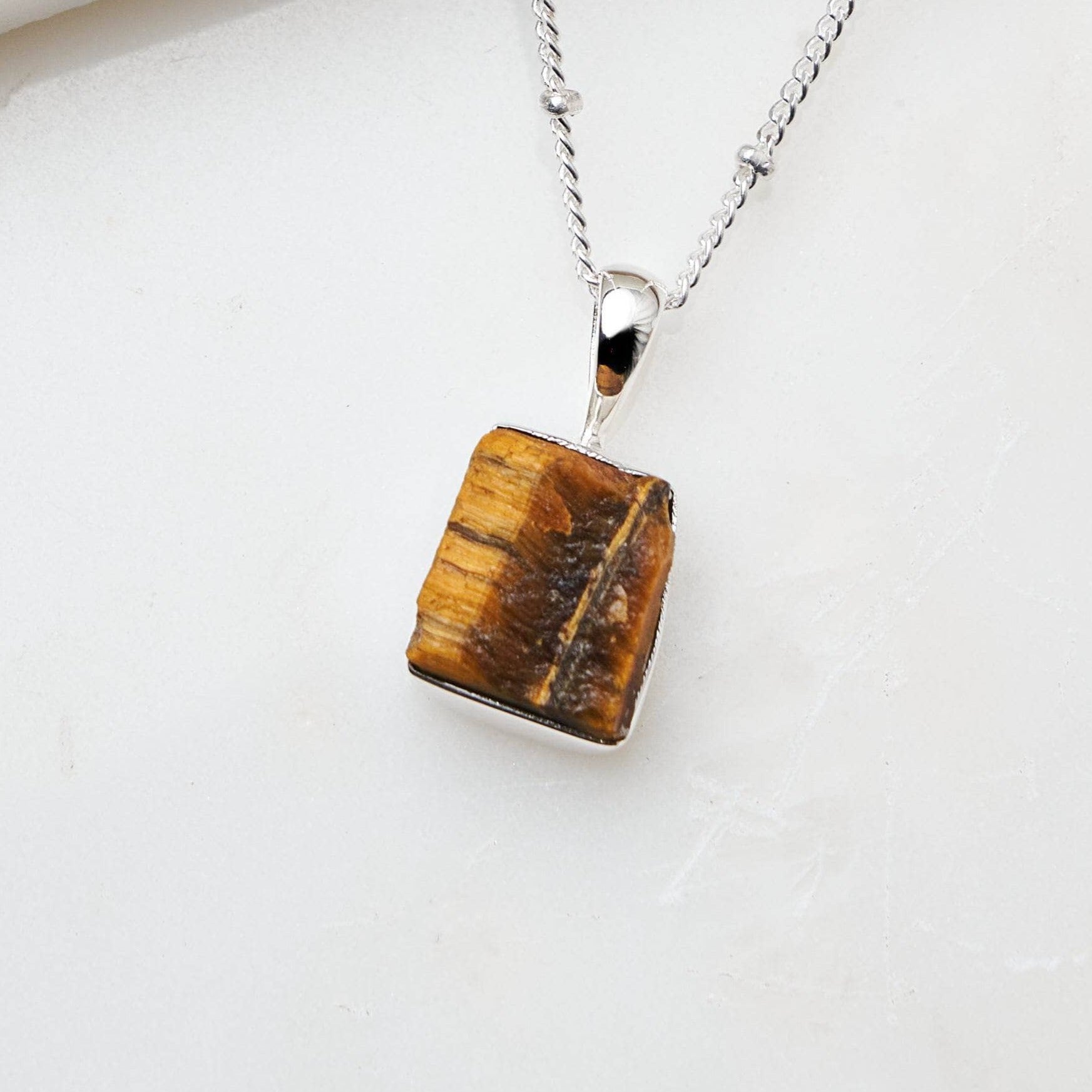 Raw crystal power brings elevated healing. When the stone comes to you exactly as nature intended, you enjoy it in its fullest power and reap the benefits of those beautiful high vibrations. This necklace also comes in either gold or silver. Silver is known to be a beautiful emotional cleanser, an immune booster, and can sharpen our mental focus. Gold is a perfect purifier and can also help with hormonal balance. You can also explore our Tiger Eye collection, including Tiger Eye Hearts, Tiger Eye Worry Stones, and Tiger Eye Palm Stones.