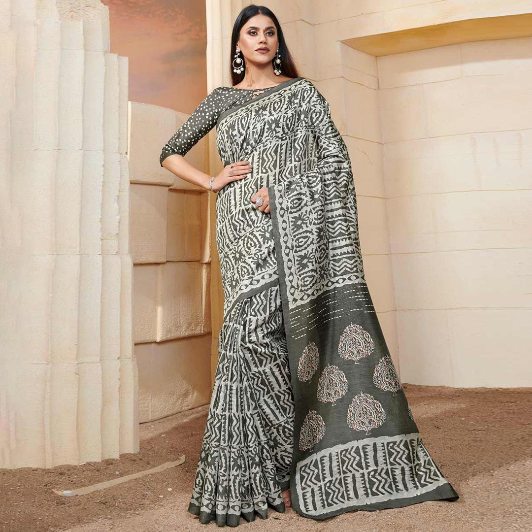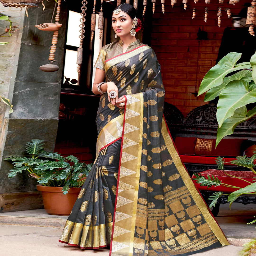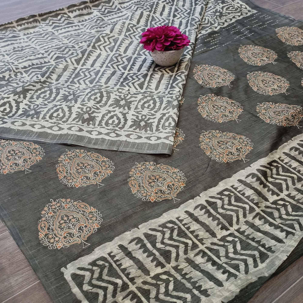 Black Tussar Silk Saree with Tree Butta Design: Experience the luxury of Tussar silk adorned with intricate tree butta motifs, offering a blend of traditional artistry and modern aesthetics.