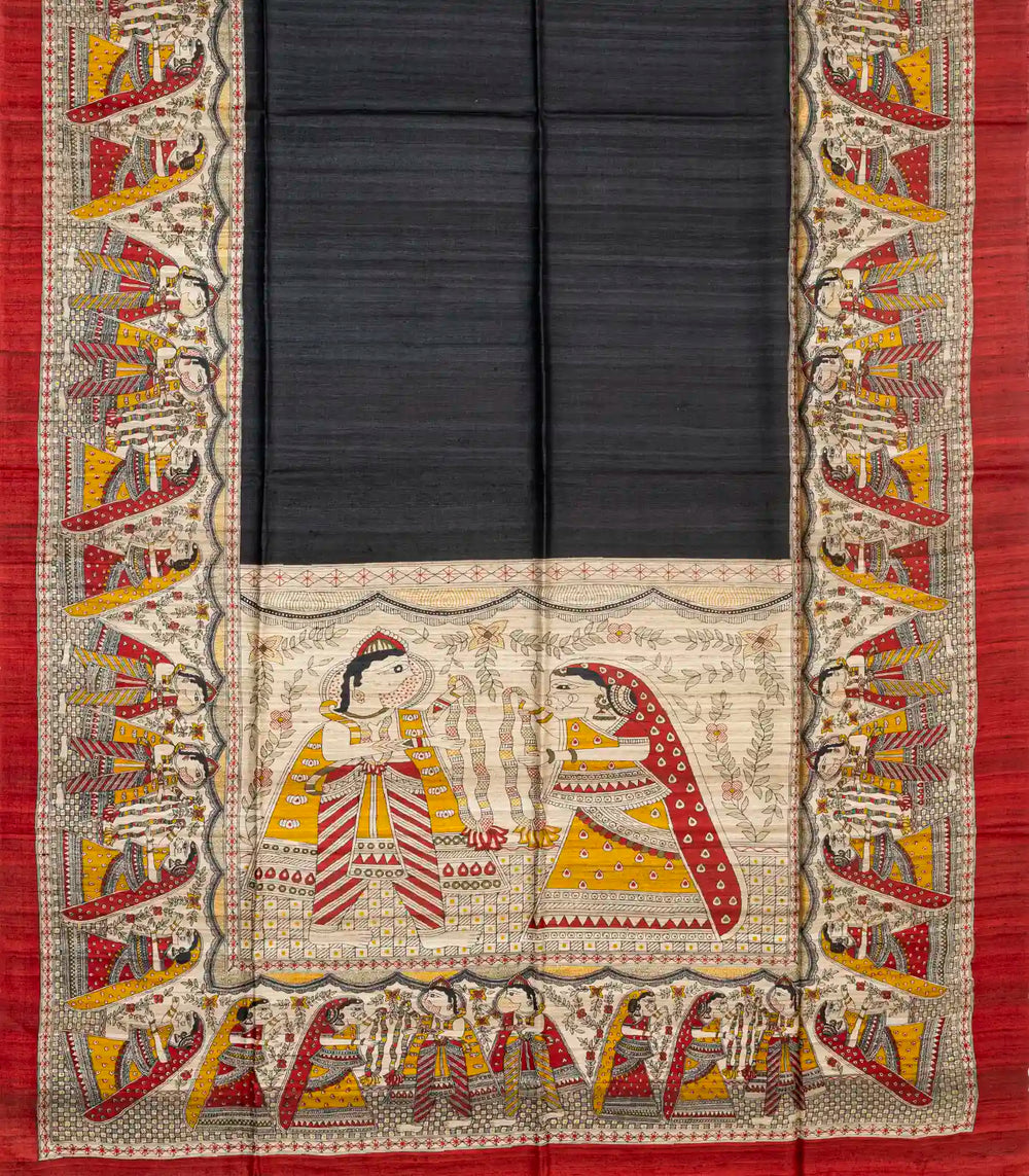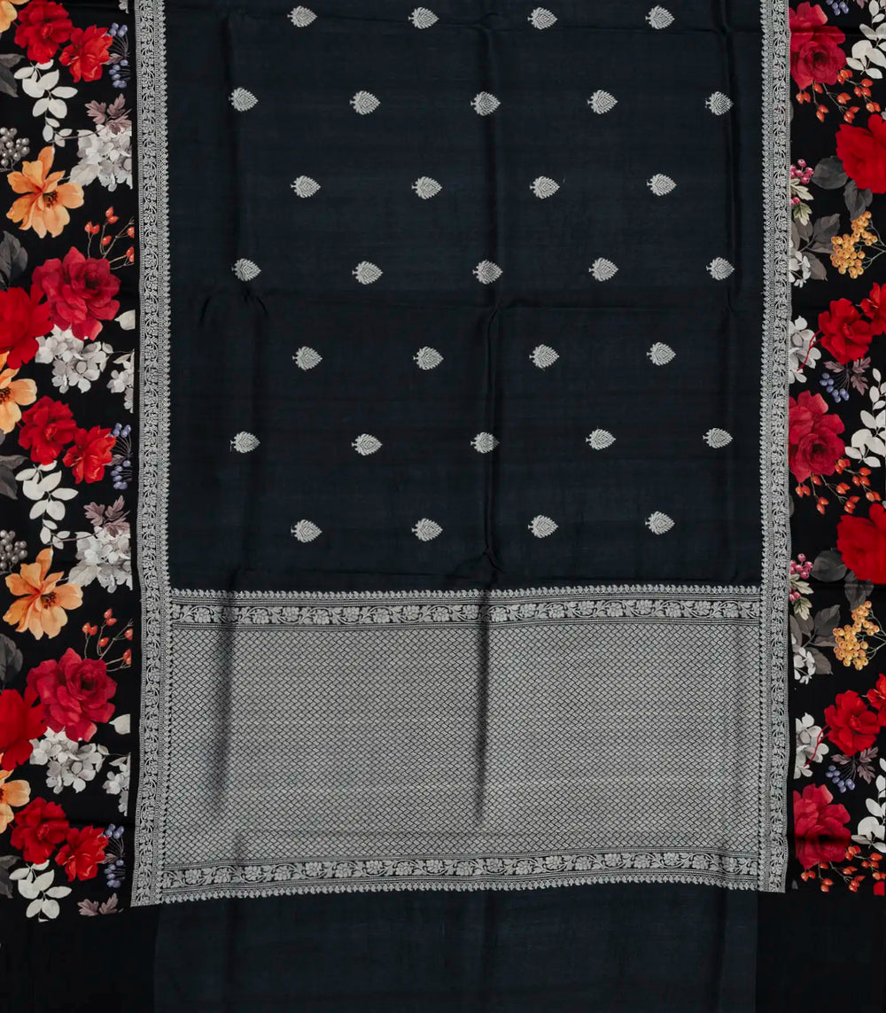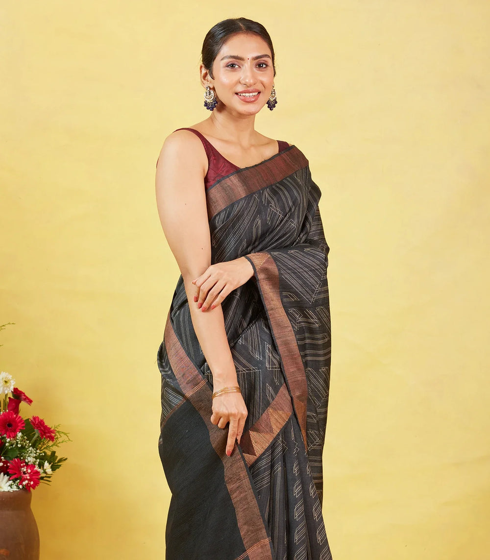 Black Tussar Silk Saree with Tree Butta Design: Experience the luxury of Tussar silk adorned with intricate tree butta motifs, offering a blend of traditional artistry and modern aesthetics.