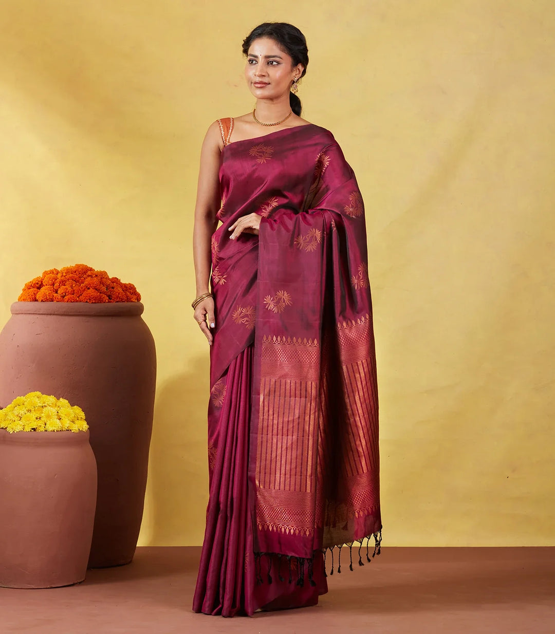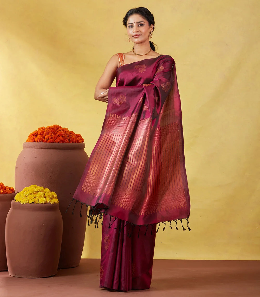 Black Tussar Silk Saree with Tree Butta Design: Experience the luxury of Tussar silk adorned with intricate tree butta motifs, offering a blend of traditional artistry and modern aesthetics.