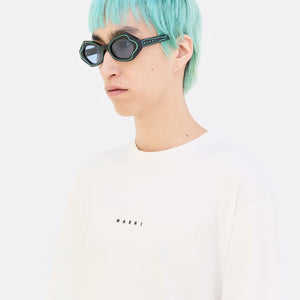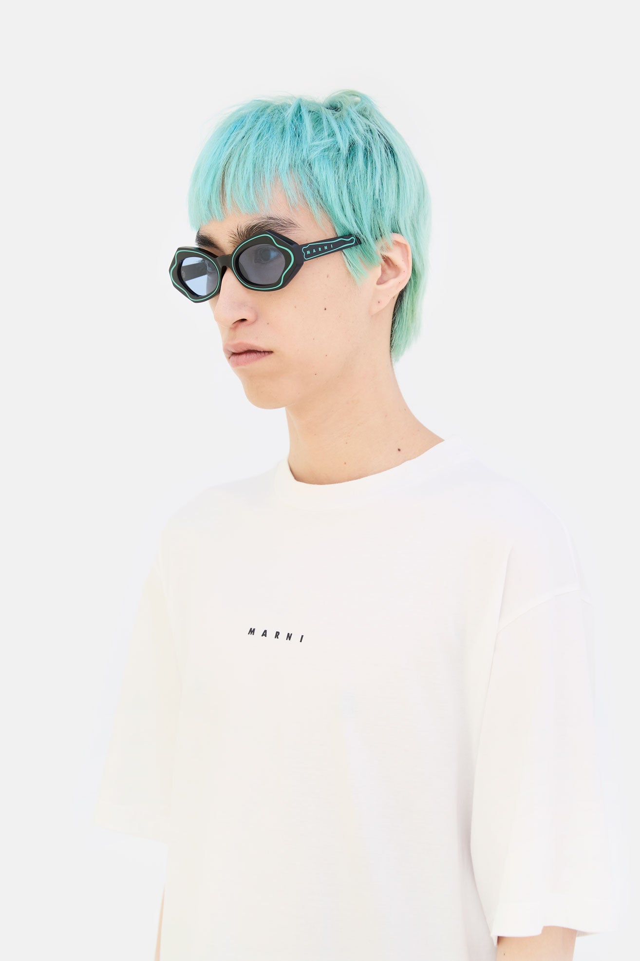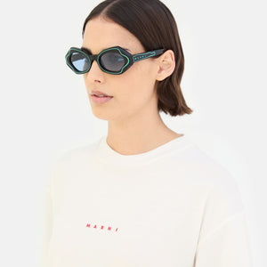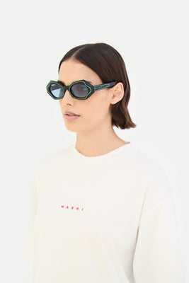 Designed exclusively for Marni, this model is a fitted silhouette that reimagines the flirty, playful appeal of classic cat-eye shapes with an experimental approach to craftsmanship. The silhouette features butterfly-like rims, with sharp angular lines on the temples and rounded curves around the nose-bridge. The model’s unique feature is a graphic line, carved around the lenses that highlights its sophisticated shape, while also creating a distinctive décor. This model comes in black acetate with green decors and blue lenses.