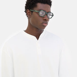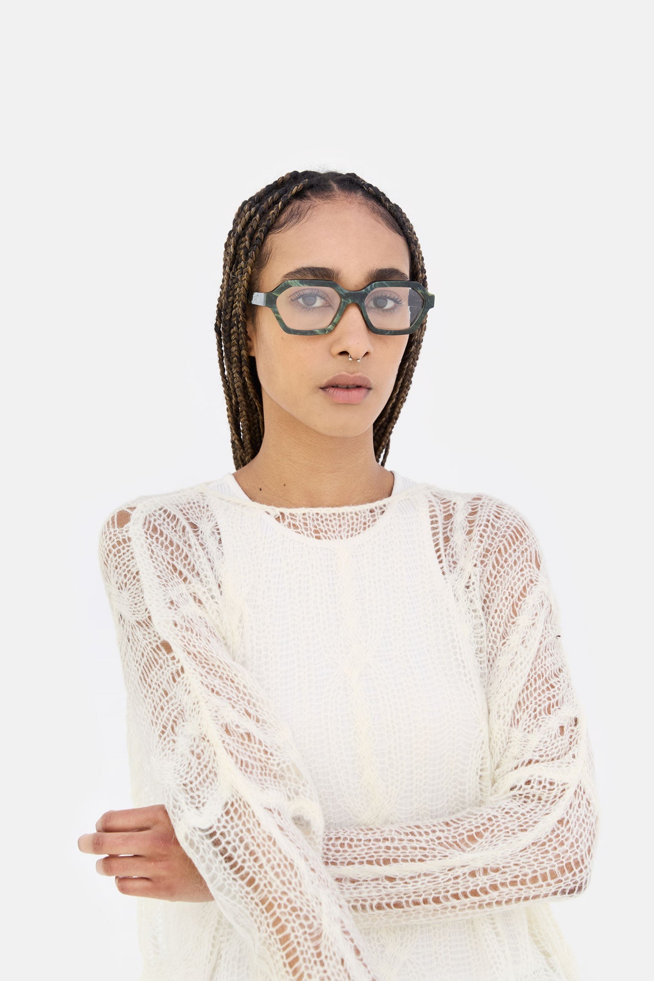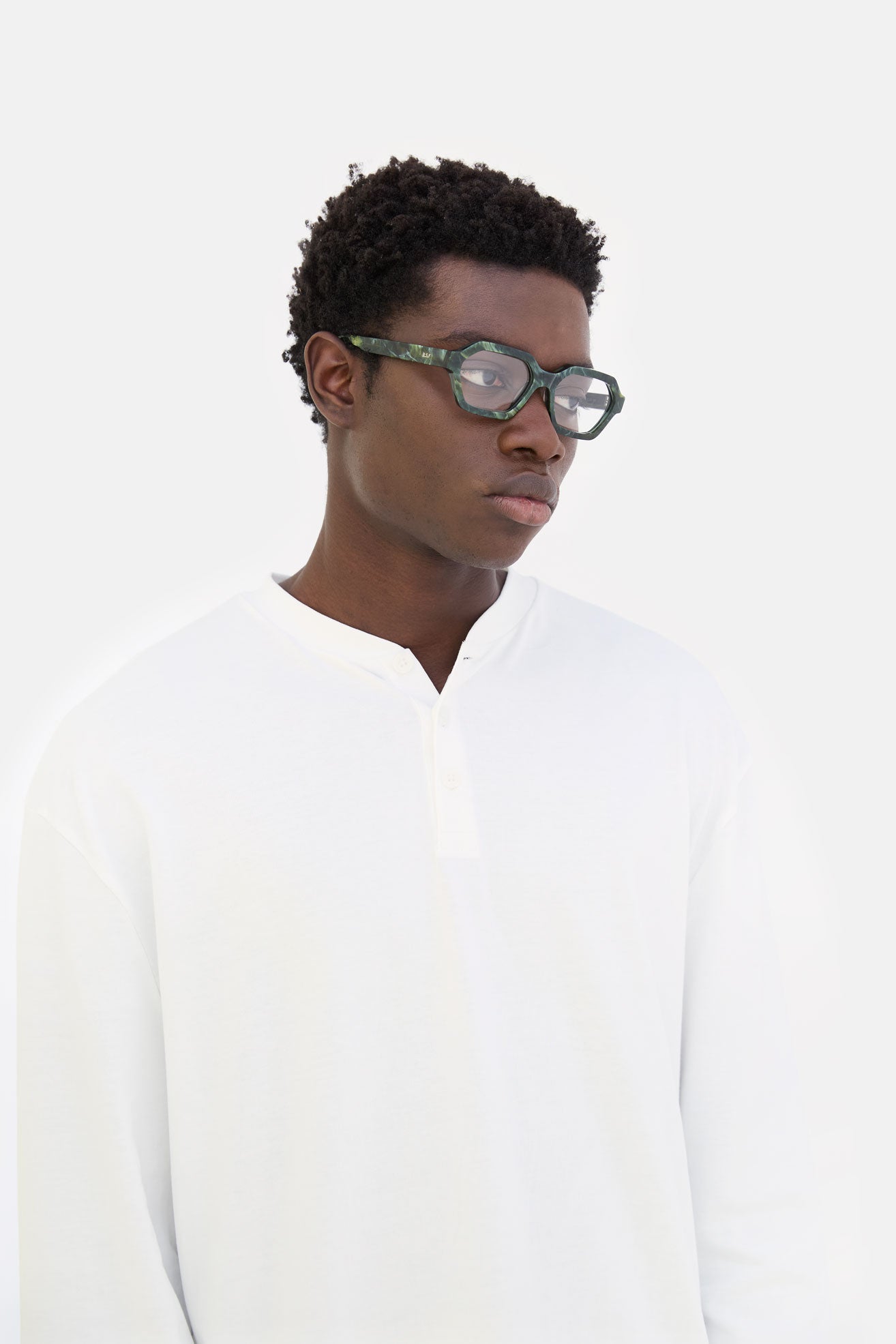 Pooch is a unique frame characterised by an asymmetrical hexagonal design. A modern, fresh shape, Pooch features a low, wide profile with a lowered nose bridge and straight, sleek temples. Designed for everyday use, this is a comfortable yet stand-out Optical silhouette. This version comes in a unique dark tortoise acetate, elevating its unique geometric design.