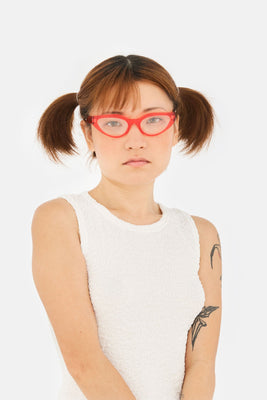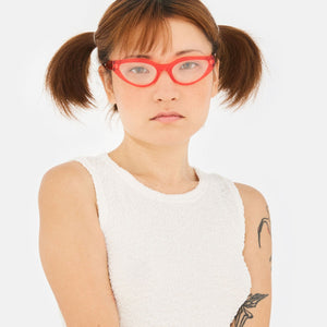 Numero 124 is a sleek yet playful cat-eye frame. Its design plays between modern essential lines and retro-inspired touches, with its clear lenses adding to that sophisticated style, this version of the N124 comes in a crystal red acetate. The sturdy construction is crafted in a functional way to maintain a lightweight frame, ensuring a comfortable wear throughout the day. Handcrafted in Italy.