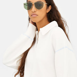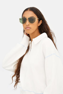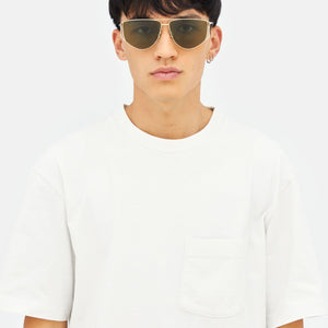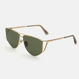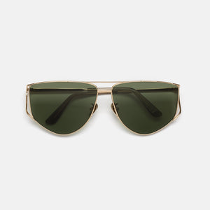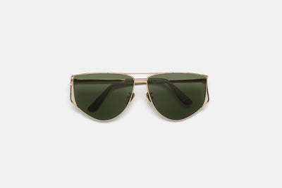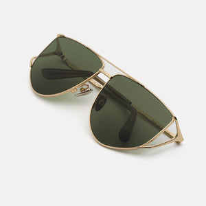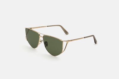 Premio is an elevated version of aviator-style sunglasses, designed to merge unique aesthetic features with technical and functional elements. Crafted from tubular metal with a custom-designed mould, the model features a lightweight construction with hollow shapes on the side of the frame, highlighting RSF’s manufacturing know-how. This model comes with gold metal and bottle green lenses.