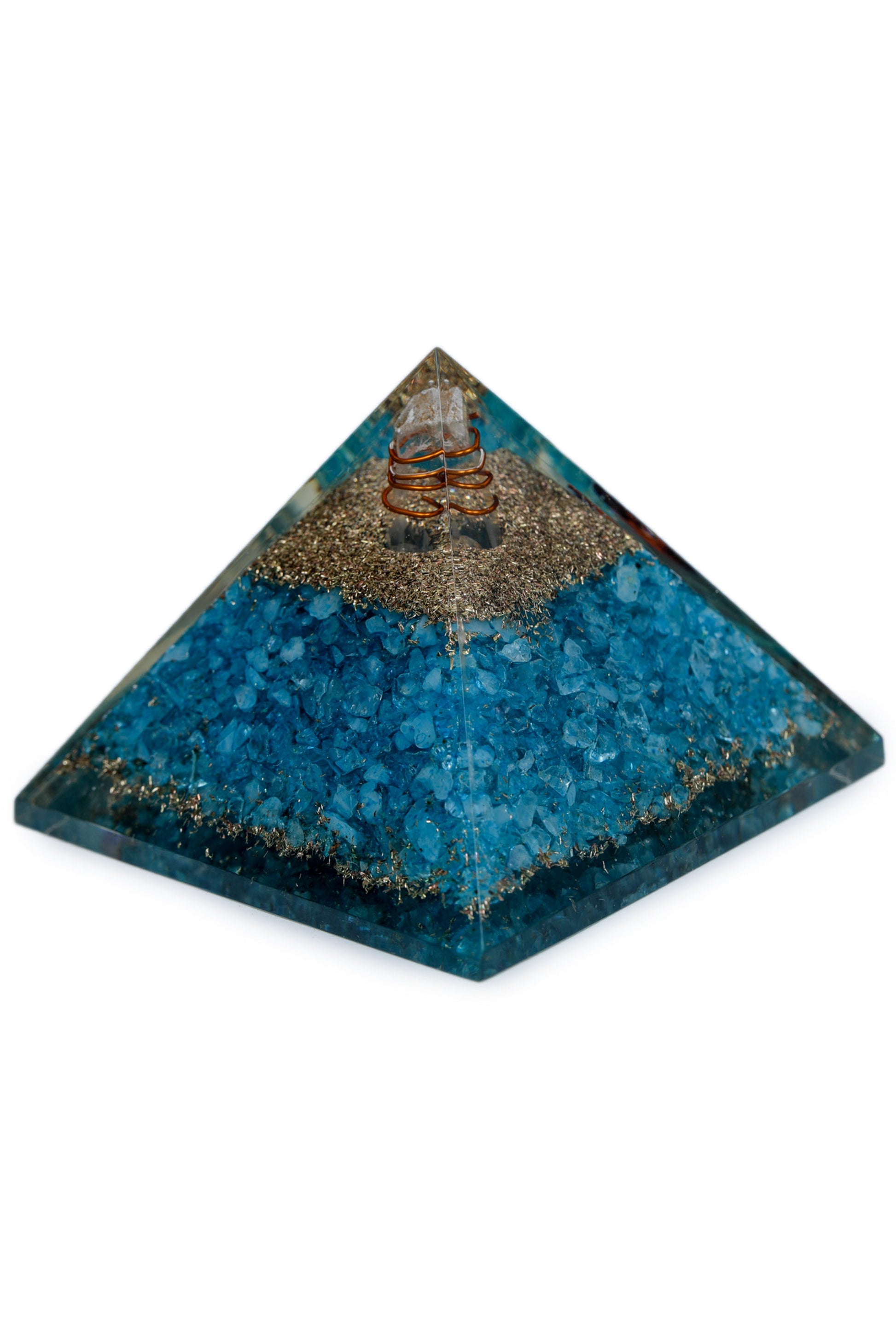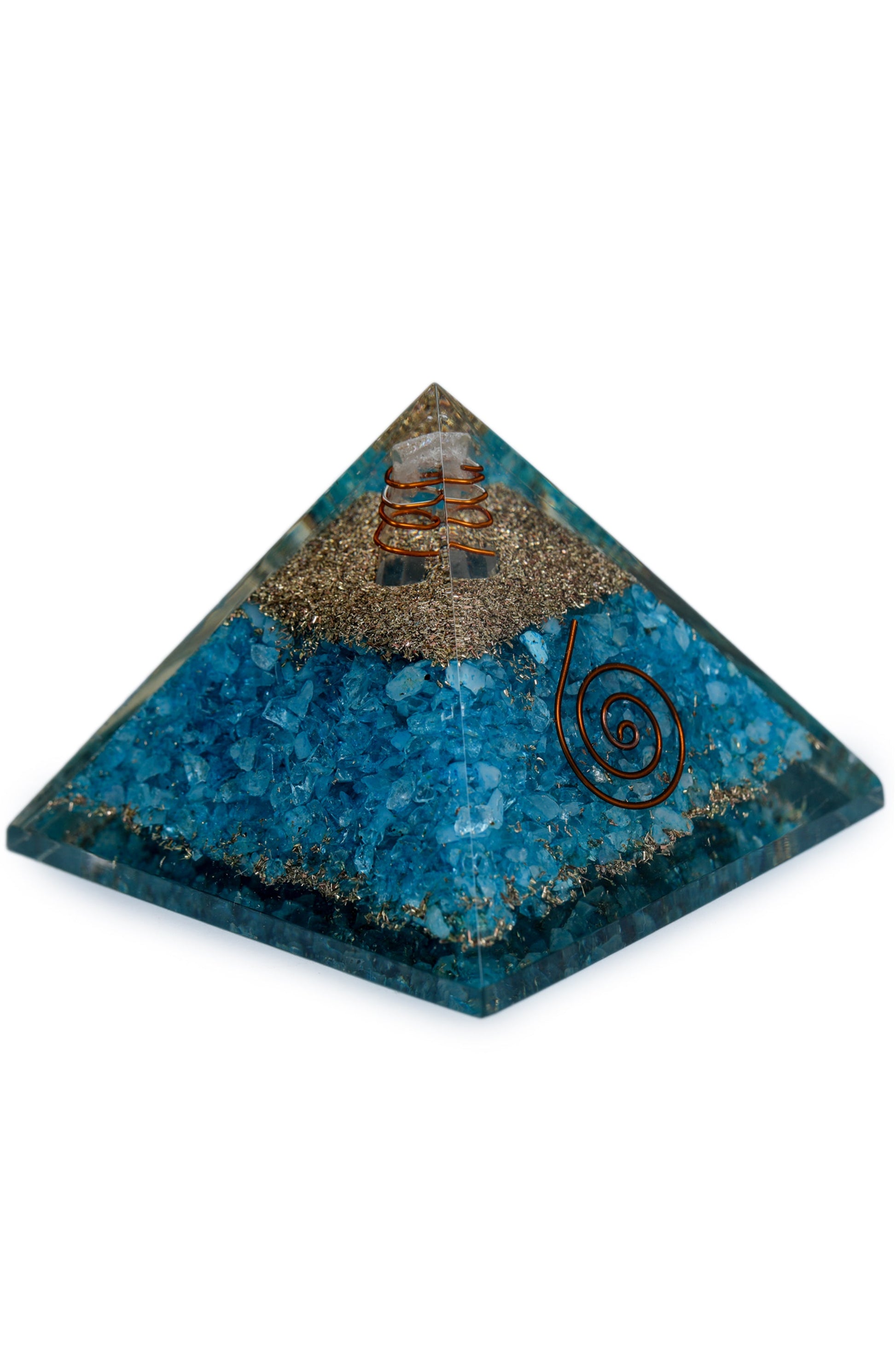 Introducing our Firoza Orgonite Pyramid, a powerful combination of orgonite and turquoise. Our orgonite converts negative energy into positive vibes while turquoise brings spiritual attunement and inner calm. This pyramid promotes emotional balance, dispels negativity, and enhances spiritual growth. Use it for energy work and holistic practices to attract money, good luck, prosperity, and positivity into your life.