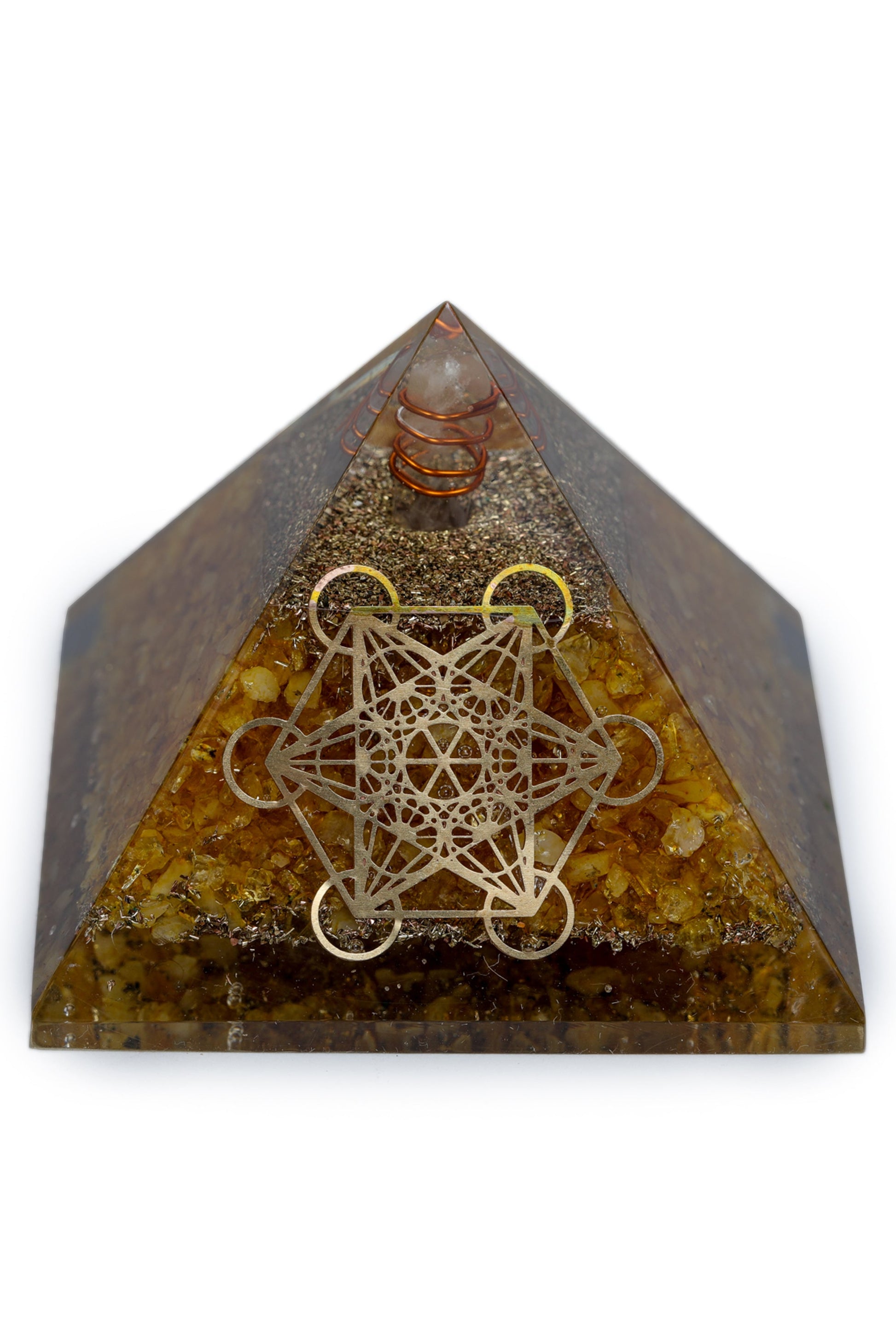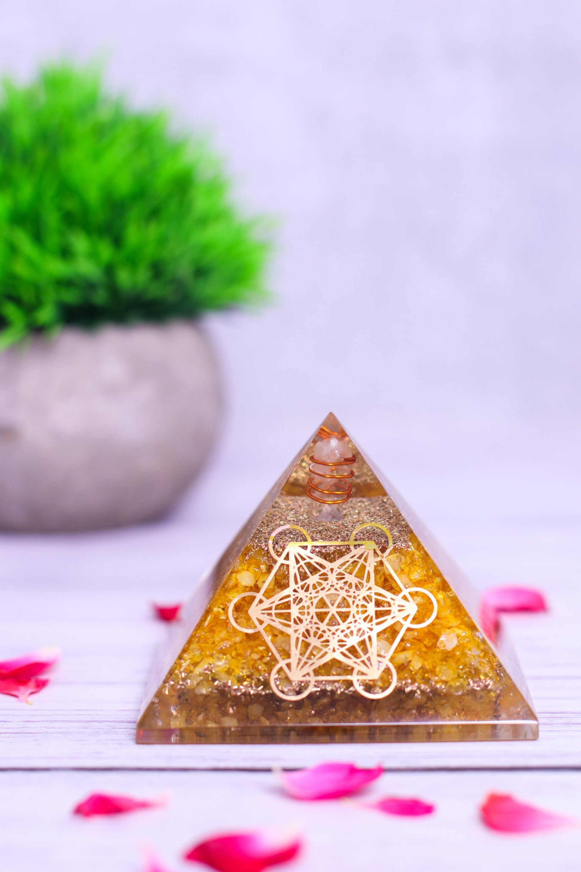 Experience the transformative power of STUDIO VAIDIK's Citrine Orgonite Pyramid. Citrine's vibrant yellow hue energizes abundance and creativity, while orgonite's energy-converting properties boost overall well-being. Linked to the solar plexus chakra, this unique pyramid promotes confidence and manifestation. Clear energy blockages and attract prosperity with this powerful energy tool.