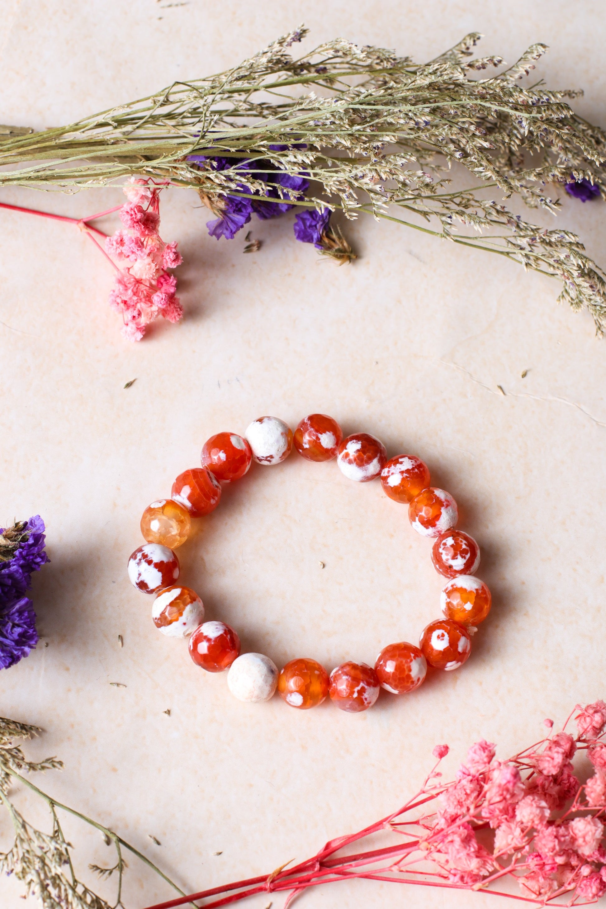 Benefits : An orange fire agate bracelet is believed to boost vitality and energy, enhancing physical stamina and motivation. It is also thought to provide strong protective energies, shielding the wearer from negativity and harm. Additionally, orange fire agate promotes creativity and self-expression, aiding in overcoming fears and achieving personal goals.