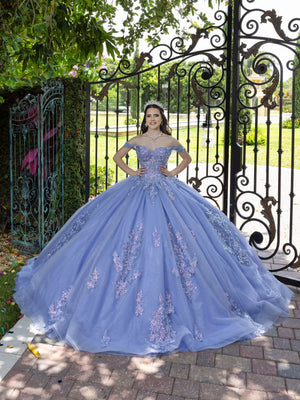 Show off your fashion sense in this 3D floral applique long off the shoulder dress with an A-line skirt by LizLuo Fiesta 56529. Inspired by a secret garden fairytale, this 3-dimensional floral gown features delicate floral lace applique that is scattered all over the gown to create a soft and unique look. Off-the-shoulder twisted tulle sleeves add a delicate touch. This look is complete with a traditional lace-up back.