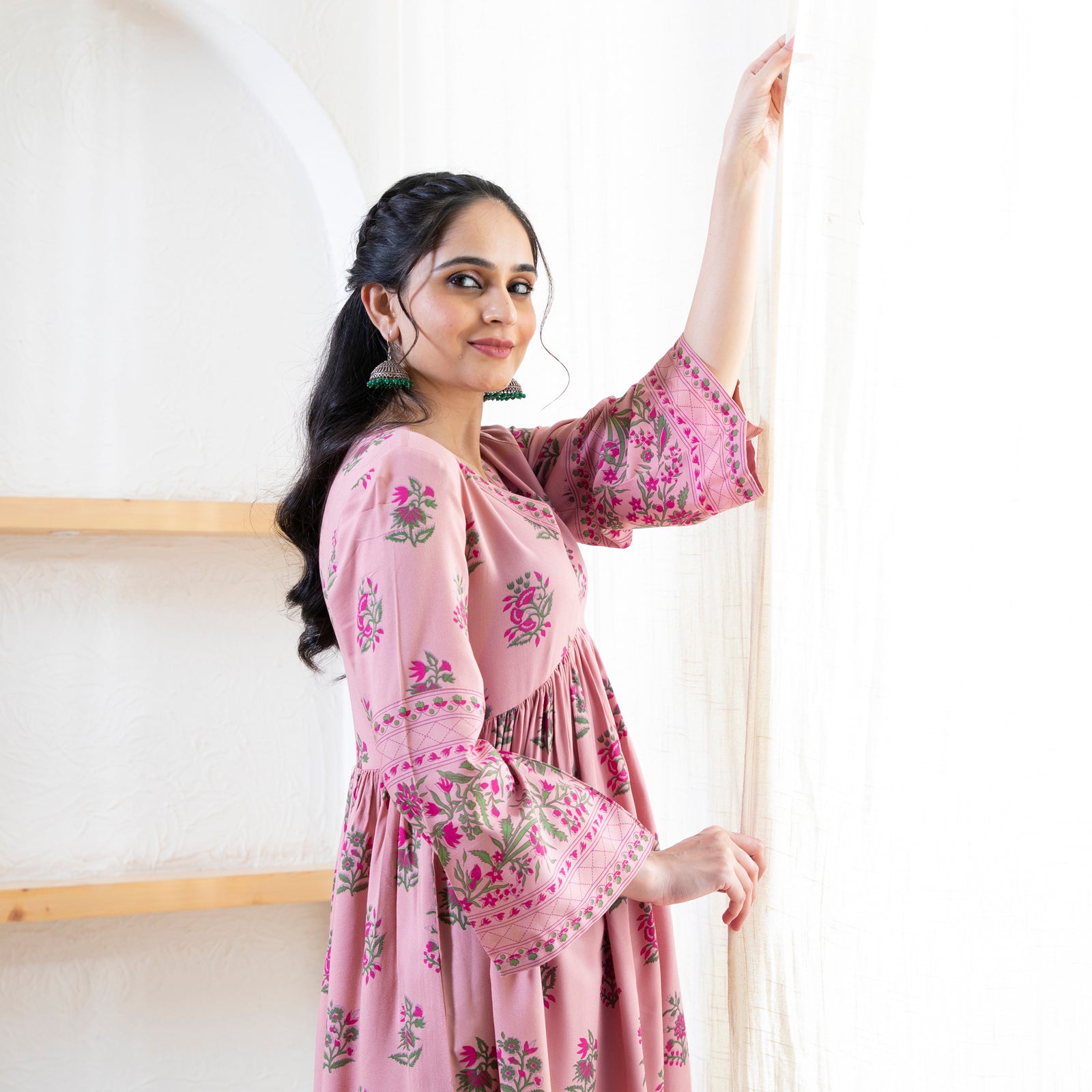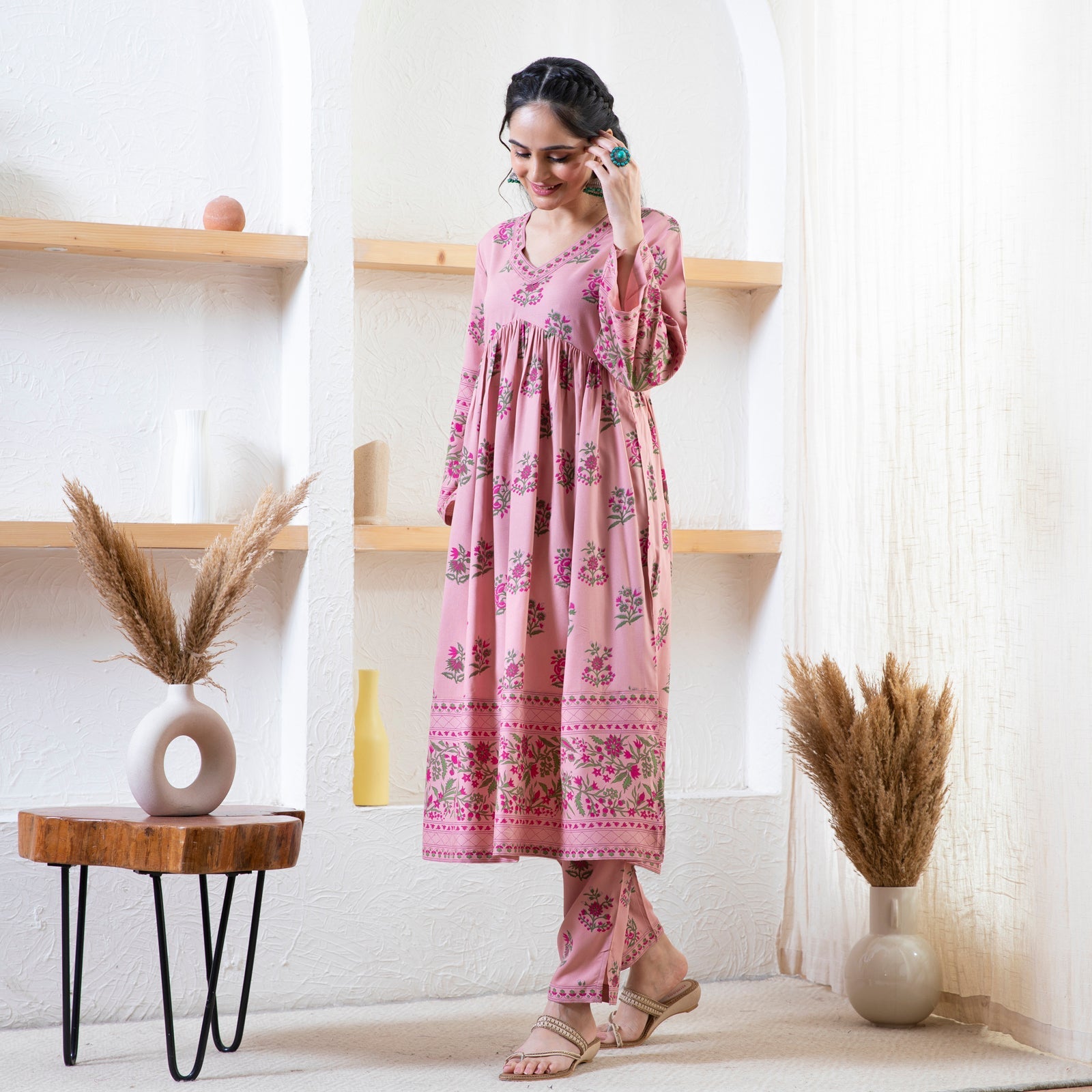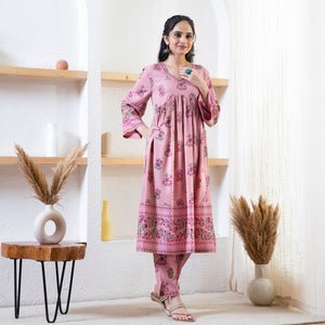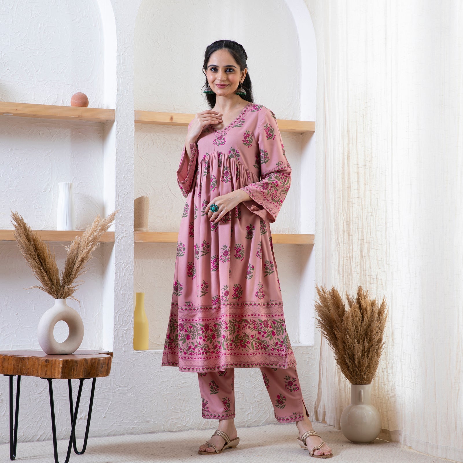 Dress in style this season with this floral jaal kurta pant set. The kurta comes with V neck, front gathers, full sleeves and pockets. The pants come with all over print and elasticated waist.