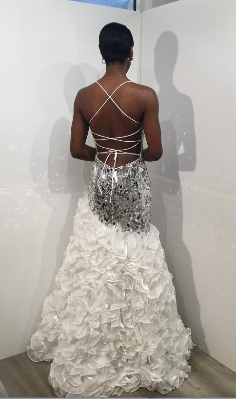 Elevate your evening attire in this mirror beaded long sleeveless dress with a fitted ruffled slit skirt by Jovani 37588. The cut glass embellished bodice adds a touch of opulence and sparkle to the ensemble, creating a dazzling focal point. The flare ruffle asymmetric bottom with a slit adds drama and movement, giving the gown a modern and chic edge. The back style features an open tie back, providing a contemporary and stylish look. The spaghetti strap low illusion V-neckline adds a hint of sensuality, framing the décolletage beautifully. The sleeveless design contributes to the overall sleek and sophisticated aesthetic.