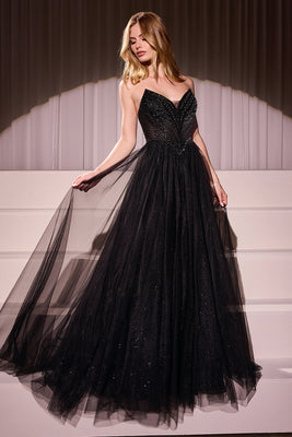 Captivate the room in this beaded long strapless tulle dress with an A-line skirt from Ladivine by Cinderella Divine CC415. Step into the spotlight in this enchanting A-line dress, featuring a pointed strapless neckline and exquisite beaded details that catch the light beautifully. The fitted bodice with a princess waistline accentuates your figure, while the lace-up corset back ensures a perfect fit for added confidence. Perfect for prom, homecoming, or any formal occasion, this layered tulle gown effortlessly combines elegance and allure.