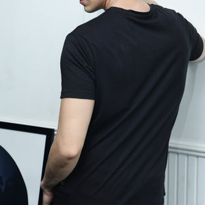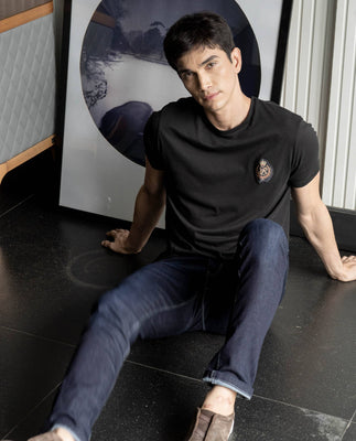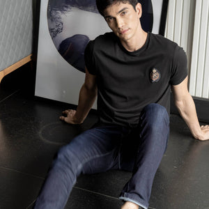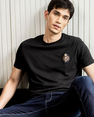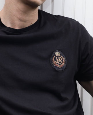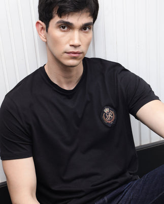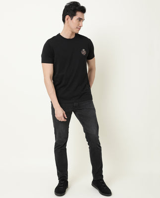 Rare Rabbit Men's Crown T Black Crew Neck Chest Embroidered Label Half Sleeves Slim Fit T-Shirt