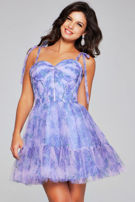 Look unforgettable in this floral print short sleeveless corset dress with an A-line skirt by Jovani 40431. This enchanting dress features a vibrant lavender floral print and a classic fit and flare silhouette. With a sweetheart neckline and sleeveless design, it exudes elegance while providing comfort and style. The tiered skirt adds a playful touch, and the sheer fabric lends an air of delicacy. This dress is perfect for proms, parties, and other special occasions.