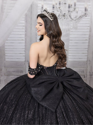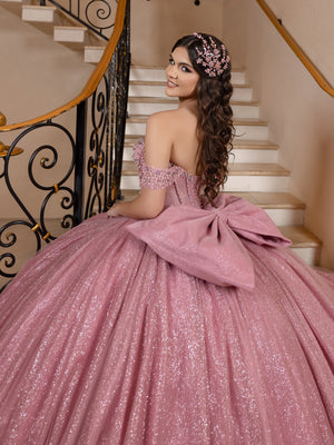 Look radiant in this beaded long off the shoulder glitter dress with an A-line skirt from LizLuo Quince by the House of Wu 26104. This princess quince gown features a fully beaded bodice with off-the-shoulder sleeves and a full ball gown skirt made of layers of sparkling tulle. The long train will ensure a grand entrance and turn heads. A back bow completes this look.