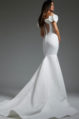 The Jovani JB40594 Bridal Gown is a stunning off-the-shoulder mermaid dress that combines romance and elegance. Crafted from luxurious satin, this floor-length gown is adorned with delicate rosette details along the neckline, adding a soft, feminine touch. The fitted mermaid silhouette accentuates your curves, flaring gracefully at the knee. The closed back adds a refined finish, making this gown perfect for a chic and unforgettable wedding look.