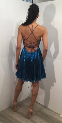 Impress your guests in this metallic short sleeveless dress with an A-line skirt by Jovani 40350. The dress features a whimsical corset bodice that accentuates your curves beautifully. Adorned with sequins, this dress sparkles with every movement, making it perfect for a night out or a special event.