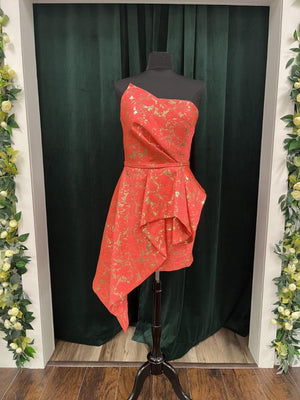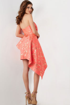 Make a statement in this mikado short strapless dress with a fitted skirt by Jovani 25668. The asymmetrical design is further accentuated with a high slit and pleated, rosette details, adding a touch of elegance. Perfect for a glamorous evening out, this dress is designed to turn heads. The sleeveless, one-shoulder neckline and short length make it ideal for warm weather events.
