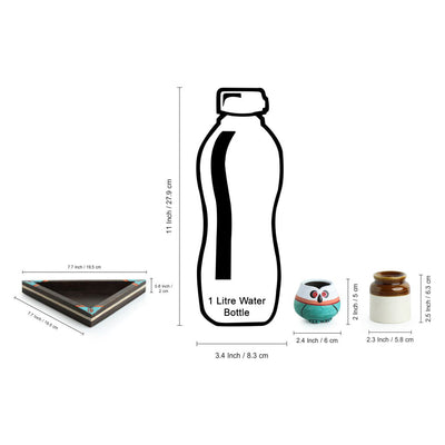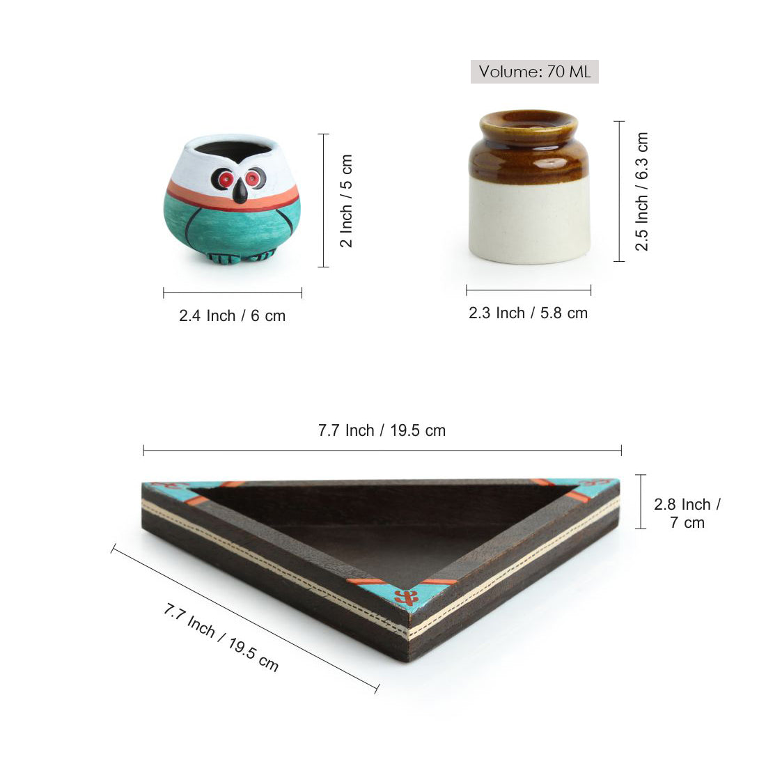 | Material | The 'Desert Owl-Jar Pack' from the collection 'The Deserted Blues' is a tableware set comprising of 1 salt shaker, 1 pepper shaker of 70 ML volume each and in brown and white colours, 1 owl-shaped toothpick holder in white and turquoise blue colour and a triangular base tray in dark brown colour which are hand-crafted elegantly in ceramic, terracotta and pinewood respectively. This tableware item is hand-painted and hand-glazed in dual tones with utmost grace by our artisans in desert flora art and is an ideal setting to be used for serving spice & pepper and holding your toothpicks. The 'Desert Owl-Jar Pack' as an exclusive home item can be used as a gifting option in housewarming parties and for setting the environment upright for some delightful and overwhelming experiences and gatherings at your abodes. |