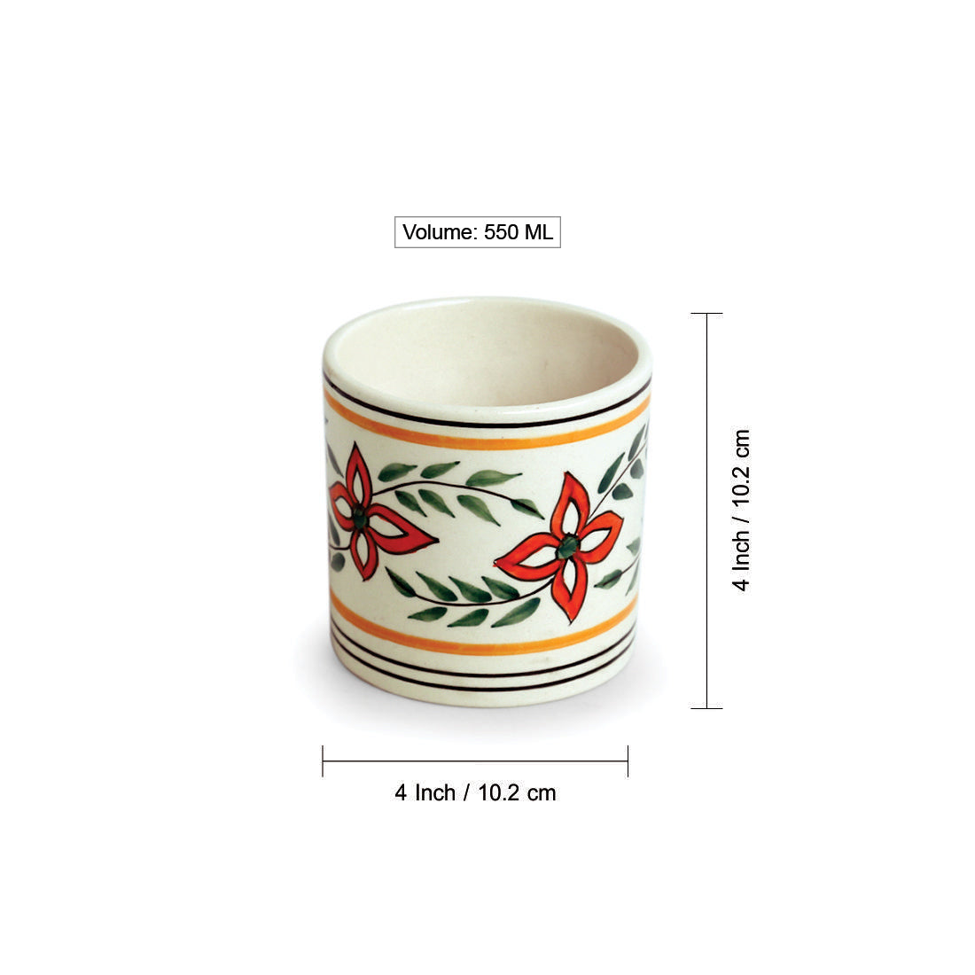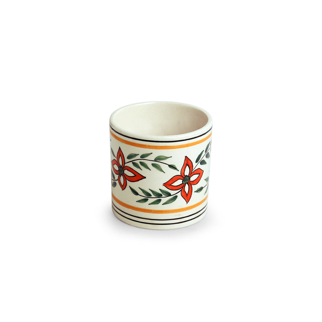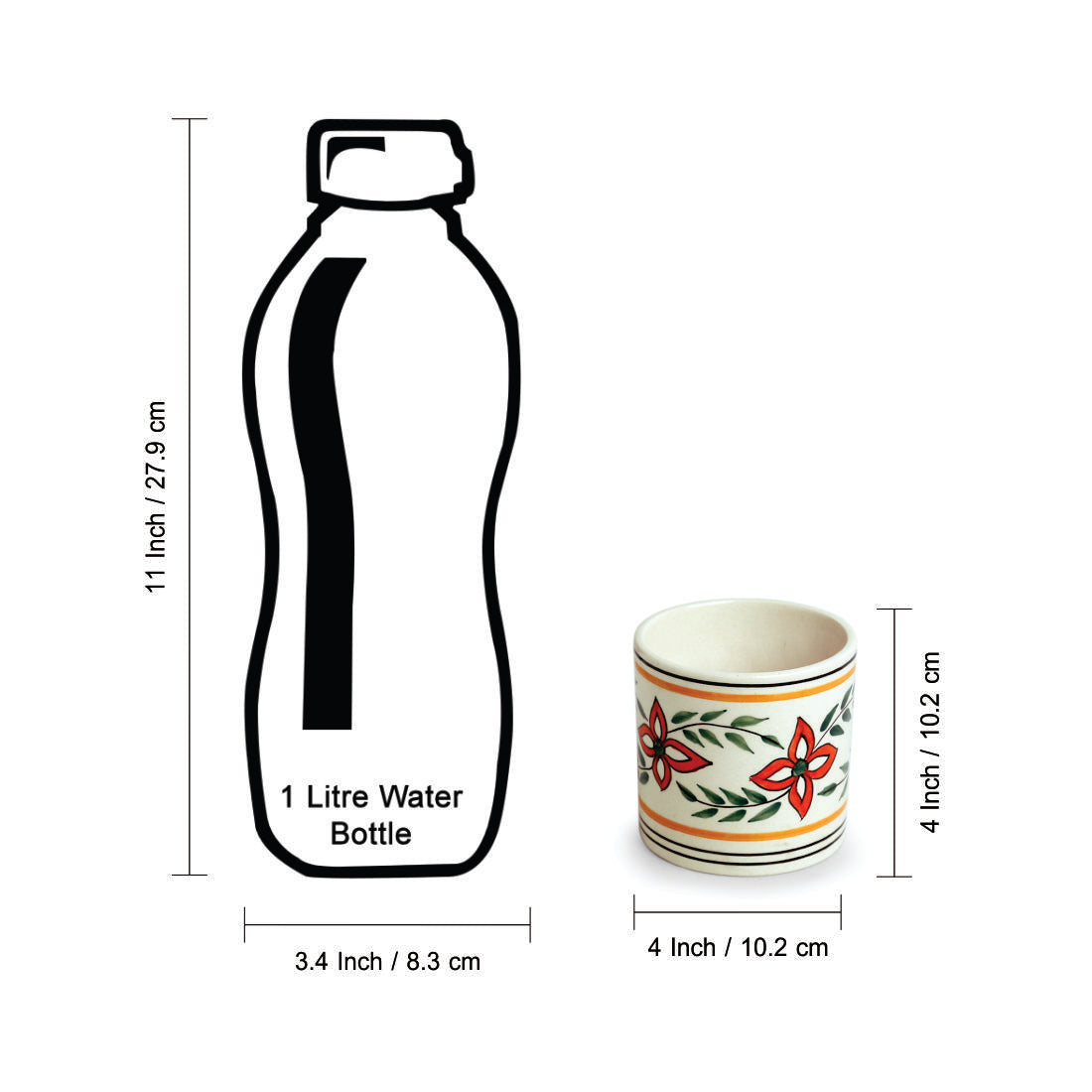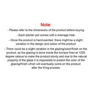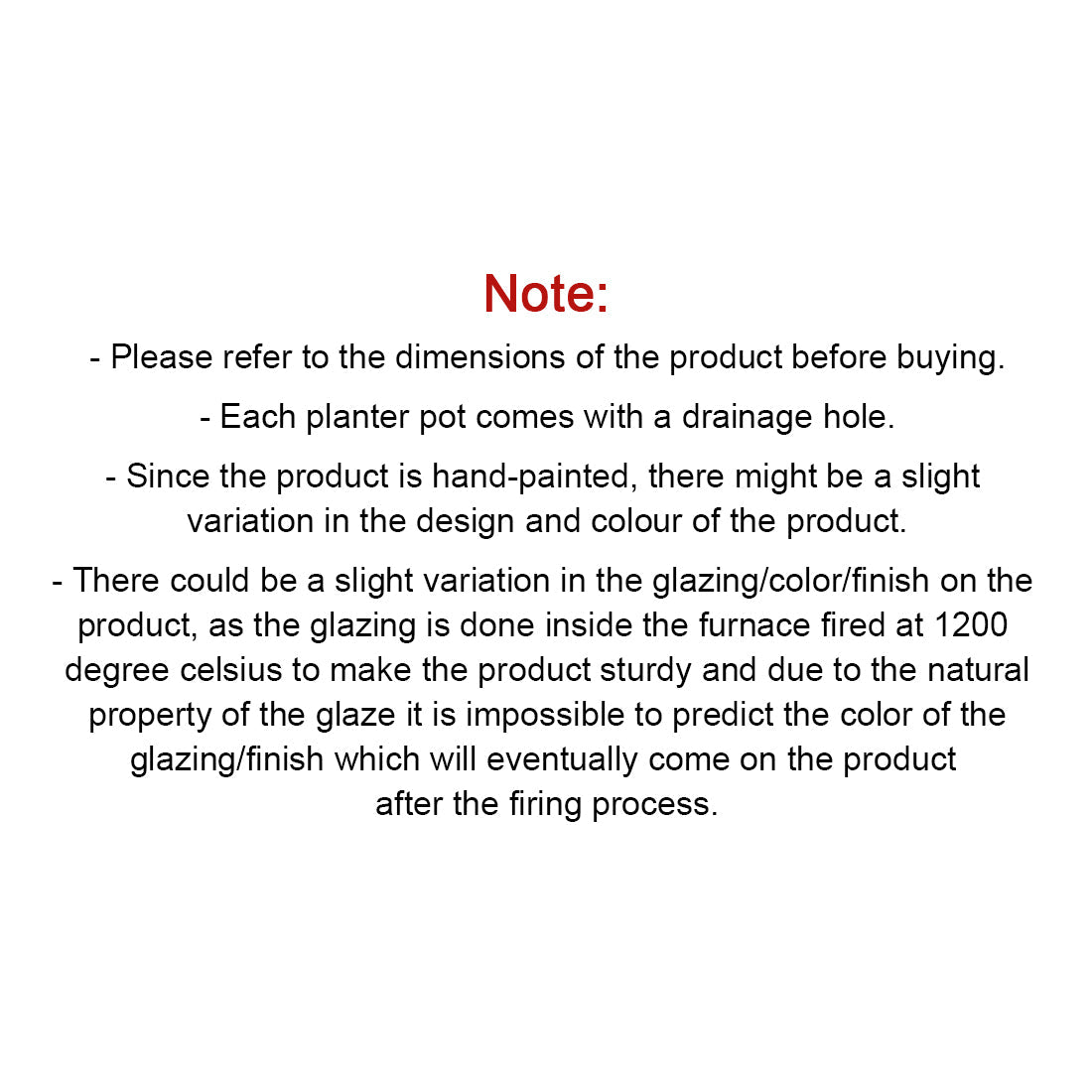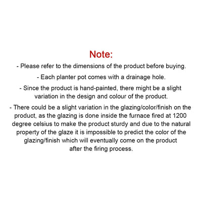 | Material | The 'Gajra - Iridescent Garlands' collection is an ode to the iconic gajras worn by Indian women since ancient times. Our artisans have drawn inspiration from a plethora of flowers used to make traditional gajras. This planter depicts the beautiful tangerine lillies entwined in sage green leaves which have been masterfully Handpainted by skilled artisans. Rooted in the ethnicity and iconic traditions of Indian culture, this handcrafted and glazed elegant ceramic planter perfect for your tables in living rooms, on windowsills, in the balcony and even garden spaces to add an old world charm to your home. Notes :- - The volume of the planter is 550 ml. - Does not come with plants as depicted in the picture. - Comes with a hole at the bottom for drainage. - The hand-painting on the product will not wear away. - As this product is Handpainted there might be a slight color, shape or design variation, which is natural and hence makes the product unique. |