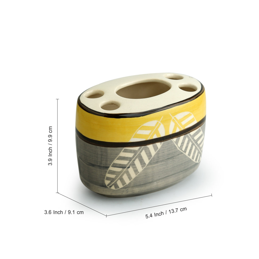 Material Handcrafted in ceramic by our artisans from interiors of the country, the 'Leaves Imprinted' is a beautiful and unique set of bathroom accessories. It comes with a toothbrush holder, a liquid soap dispenser and a soap dish, that when put together fit into a complete set, to complement your bathroom spaces. This family of bathroom essentials has been made and finished to detail by hand, glazed in elegant shades of grey - rimmed in a glossy lemon and is the perfect functional addition to your home. Making daily bathroom storage organised, aesthetic and elegant, this set is handmade with love; capturing and preserving the indigenous character of an ancient Indian ceramic culture.