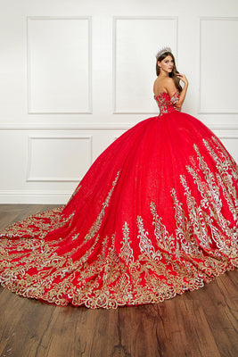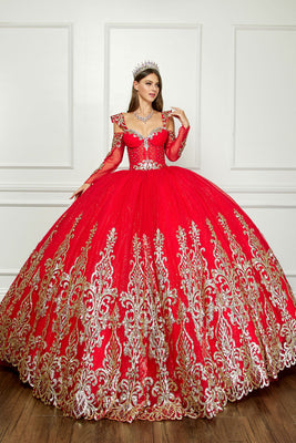 Make a grand entrance in this glitter applique long off the shoulder long sleeve dress with A-line skirt by Petite Adele PQ1065. Shimmering gold glitter throughout the entire dress, creating a breathtaking masterpiece. The bodice features a romantic sweetheart neckline, adorned with gems and rhinestones that sparkle with every move. Off-the-shoulder long sleeves add a touch of elegance, while a hidden zipper and lace-up back ensure a perfect fit. This show-stopping quinceanera dress will make you the star of your celebration!