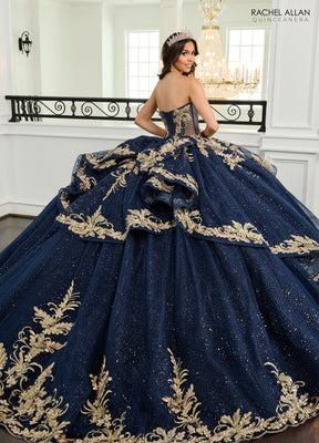 Look like a fairy-tale Princess in this embroidered lace applique long strapless puff sleeve dress with A-line skirt by Rachel Allan RQ3153. The full glitter tulle skirt is lavishly adorned with intricate gold appliqué and beading, creating a majestic look. The structured corset bodice, embellished with 3D flowers, enhances your figure, while the detachable puff sleeves and bow add versatility and drama. Ideal for quinceañeras or grand celebrations, this gown promises to make you feel like royalty as you captivate everyone with its luxurious details and timeless design.