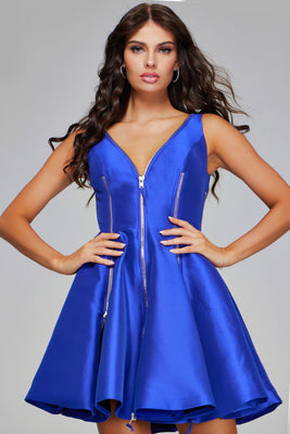 Impress your guests in this satin short sleeveless dress with an A-line skirt by Jovani 39821. Made from luxurious satin fabric, it flaunts a deep V-neckline and sleeveless design, ideal for showcasing your shoulders and arms. The dress is accentuated with contemporary zipper details, adding a touch of edgy sophistication. The V-back style adds an additional element of allure, making it perfect for evening parties or special occasions.