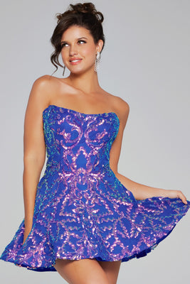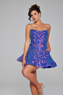 Have a magical moment in this sequin print short strapless dress with an A-line skirt by Jovani 39927. Stand out in this glamorous strapless short dress, adorned with captivating sequin detailing. The A-line silhouette and vibrant blue color make it perfect for any special occasion, offering a stunning fit and flare look. Whether it’s a cocktail party or a night out, this dress combines elegance and charm effortlessly.