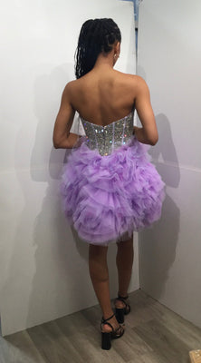 Look super cute in this sequin bodice short strapless dress with an A-line ruffled skirt by Jovani 39748. This eye-catching dress features a strapless sweetheart neckline and beaded bodice. The short length and ruffled details add a playful touch, while the purple tulle fabric creates a stunning look. Perfect for any special occasion, this dress combines elegance and fun effortlessly.