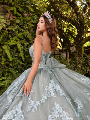 Look timeless in this applique long sleeveless sheer corset dress with an A-line skirt by LizLuo Fiesta 56531. This modern Quinceanera gown features delicate spaghetti straps and a sheer corset bodice with stunning lace applique. The full ball gown skirt showcases a beautiful floral lace applique for a dramatic statement. The bottom hem features a contemporary ruffle design that extends all the way down the train.