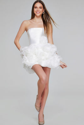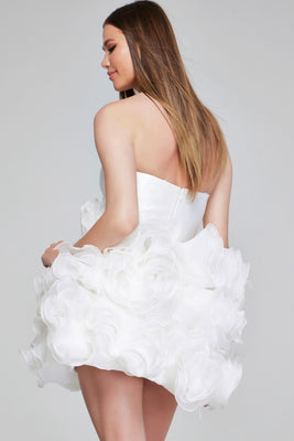 Light up the room in this taffeta short strapless dress with an A-line rosette skirt by Jovani 40334. This stunning short dress features an enchanting strapless neckline that beautifully highlights the shoulders. Made from luxurious taffeta fabric, the dress showcases intricate rosette details that add a touch of romantic charm. The fit and flare silhouette ensures a flattering fit, making it perfect for any special occasion. Elevate your look with this exquisite dress and make unforgettable memories.