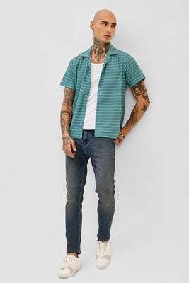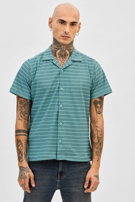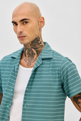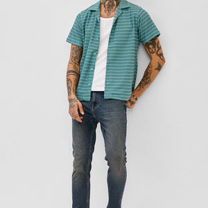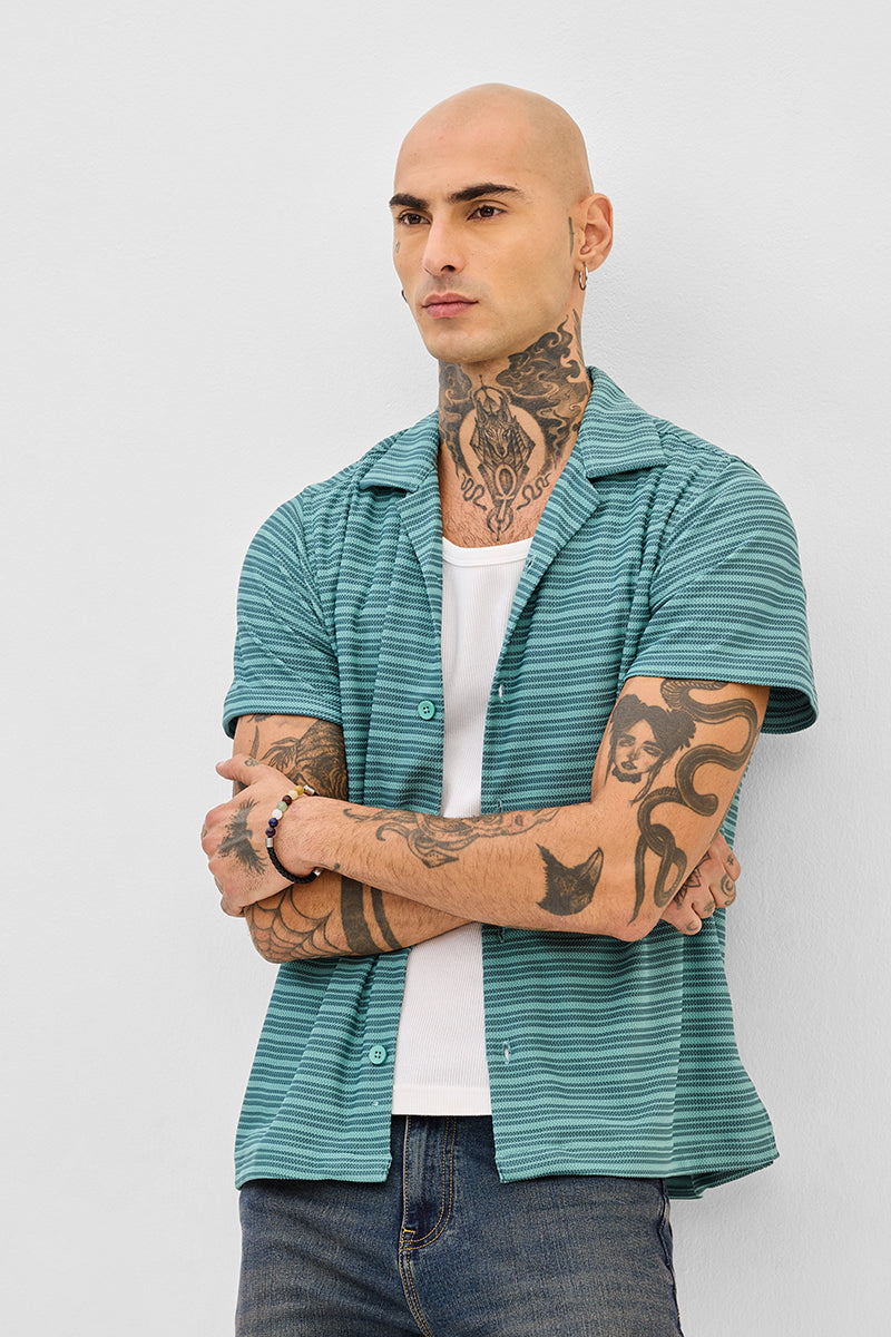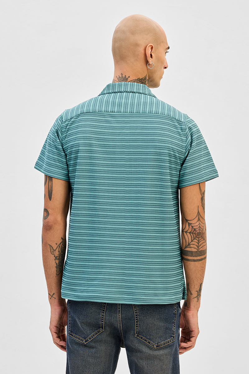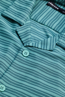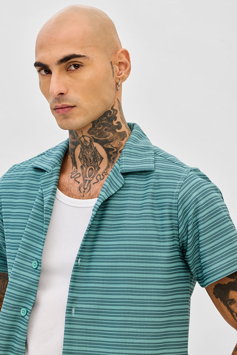 Give a majestic lift to your look with this turquoise stripes pattern shirt. The shirt is crafted from fine 100% polyester. It is a versatile staple and great for teaming with jeans for a more casual look or smartening up with a classic pair of chinos.