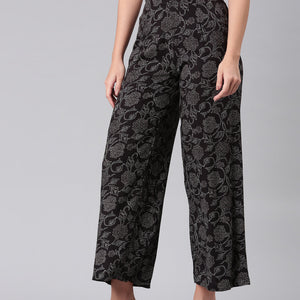 Go from meetings to a club in a jiffy in a pair of Black Mid Rise Printed Palazzos paired with a button up shirt. Made from viscose, it is has a wide leg silhoutte & is a mid-rise palazzo with elasticised waistband & a side slant pocket.
